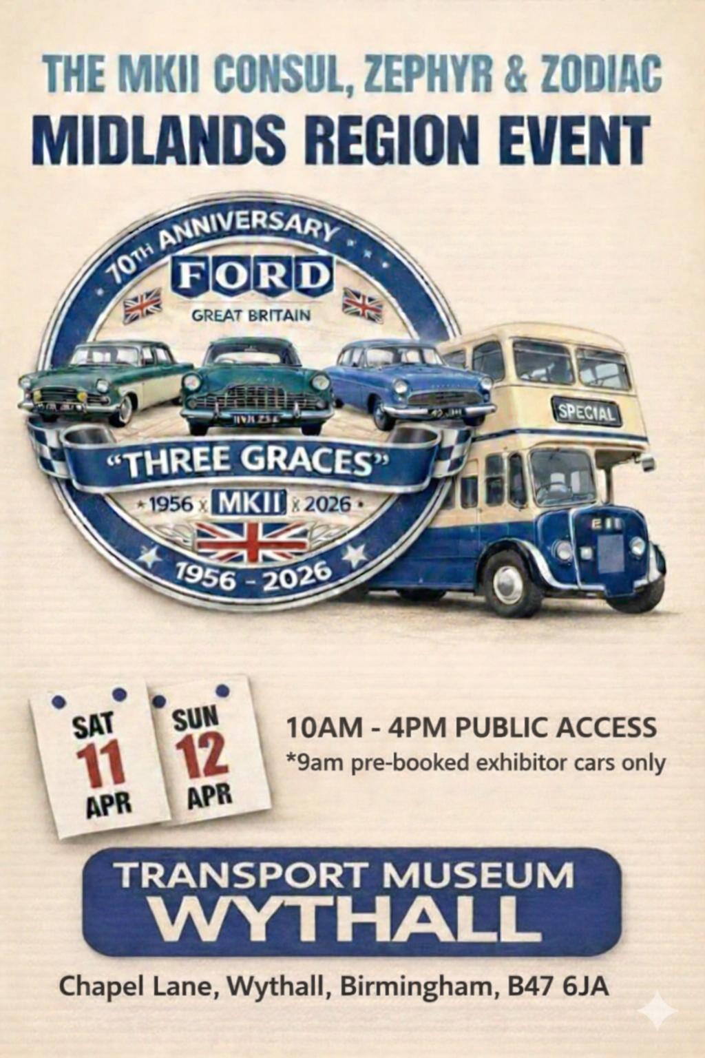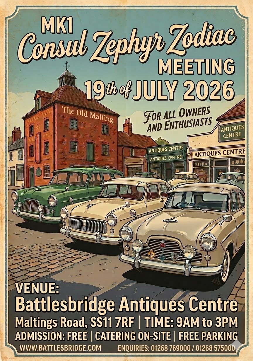 The Midlands Area of the Ford Consul, Zephyr, Zodiac MK2 Owners Club, cordially invite you to celebrate the 70th Anniversary of the launch of The Three Graces, Ford's Consul Zephyr and Zodiac MK2 and also the 60th Anniversary of the launch of The Ford Zephyr and Zodiac Mk1V. All Marques of Consul, Zephyr and Zodiac...